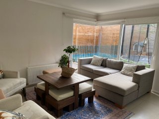 Excelente casa modelo Albatros ubicada en condominio con acceso controlado. Cerca de supermercados, strip center, colegios y comercio en general. Muy buena conectividad con Autopista Los Libertadores. Distribución Primer piso: acceso, baño de visitas, living y comedor, salida a terraza, cocina amplia completamente equipada y con comedor de diario, logia. Habitación principal con baño en suite y wallkig closet, habitación de niño o escritorio. Segundo piso: amplia sala de estar, dos habitaciones y un baño completo. Equipamiento: calefacción central, piscina con sistema ionizador y con reja de protección, jardín con riego automático, aire acondicionado, paneles solares lo que permite un ahorro del 100% de electricidad en verano y primavera, entretecho habilitado como bodega, purificador de agua en cocina. Gastos comunes $55.000